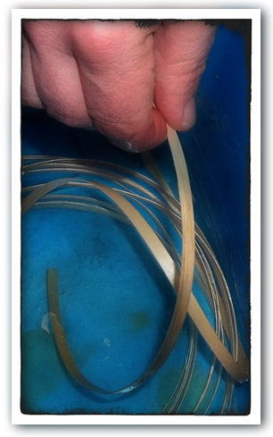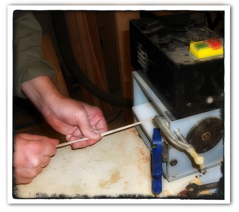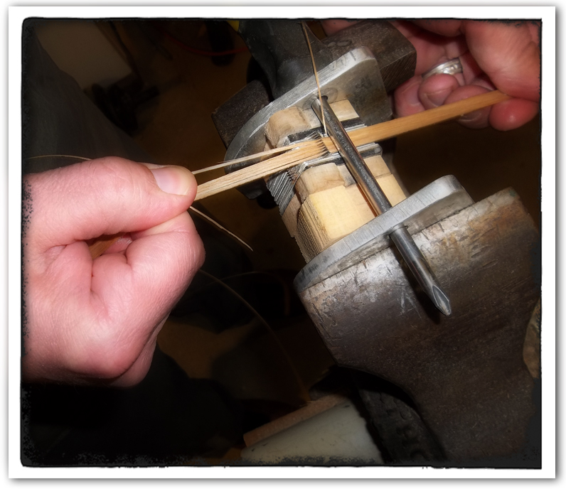 Eric: I’m going to cut the width of the weavers. You see, this tool has a bunch of razor blades separated by tiny spacers. If I carefully pull the splint through it, it will slice my weavers to the width I need.
